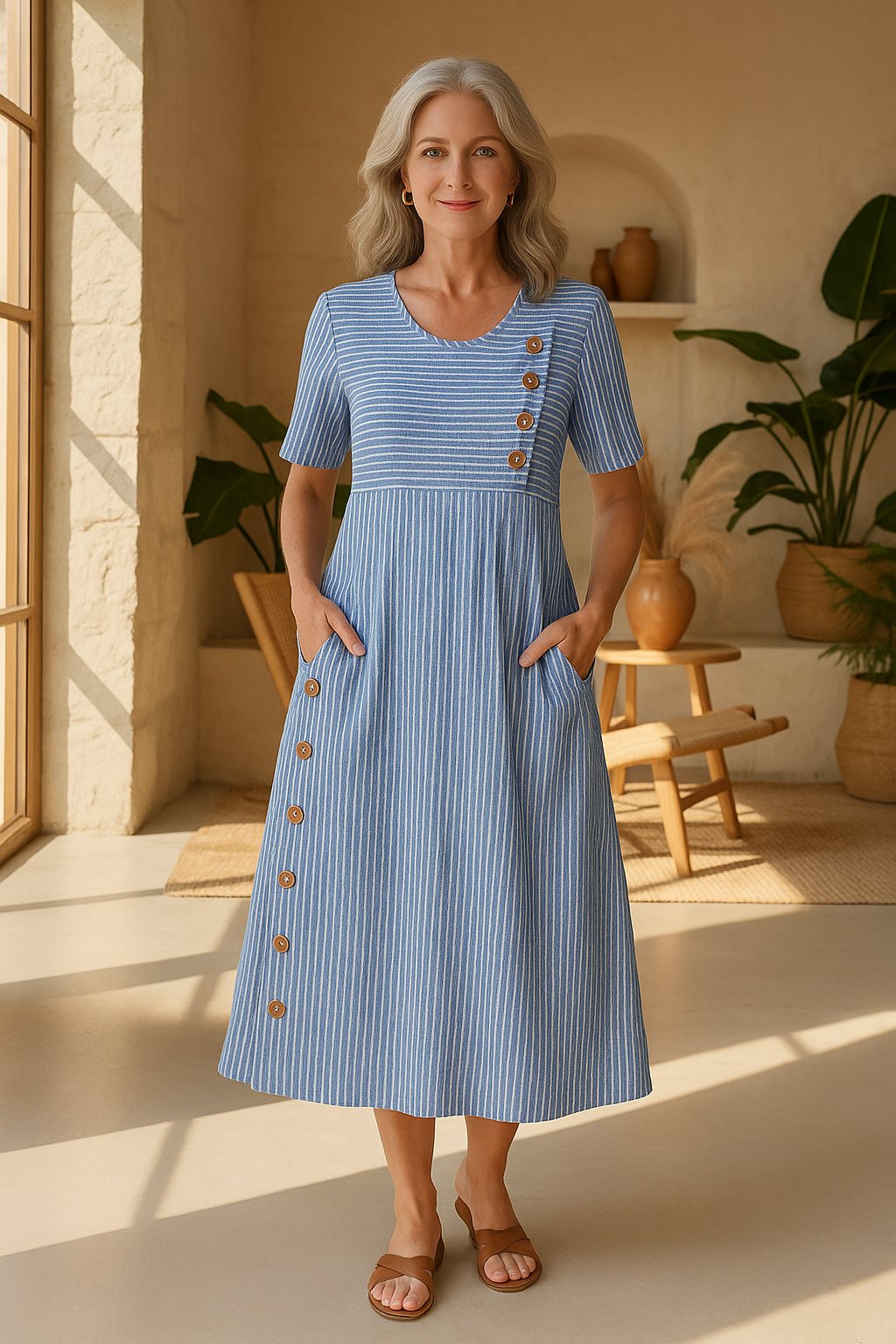 Denne smigrende Janea Midi Kjole kombinerer lethed og komfort med et design, der fremhæver silhuetten og dækker maven delikat. Dens tidløse stribede mønster tilføjer et klassisk og friskt præg, mens de brede 3/4 ærmer giver en luftig alsidighed. Den flydende midi-længde sikrer en smuk dækning og en perfekt balance, ideel til de varme dage, hvor du ønsker at føle dig elegant og komfortabel. Perfekt til daglige udflugter, weekendmarkeder eller en uformel brunch.
